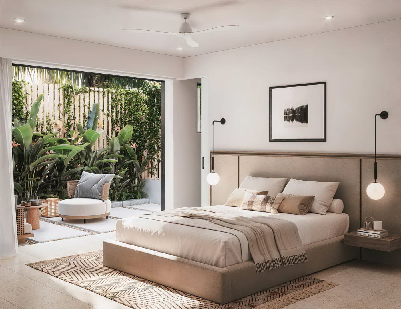 The architecture blends contemporary lines with natural textures, incorporatingvolcanic basalt stone,timber finishes, and lush indigenous landscaping. Inside, large windows and sliding glass doors invite natural light and frame sweeping sea views, while neutral tones and high-end finishes add warmth and sophistication.