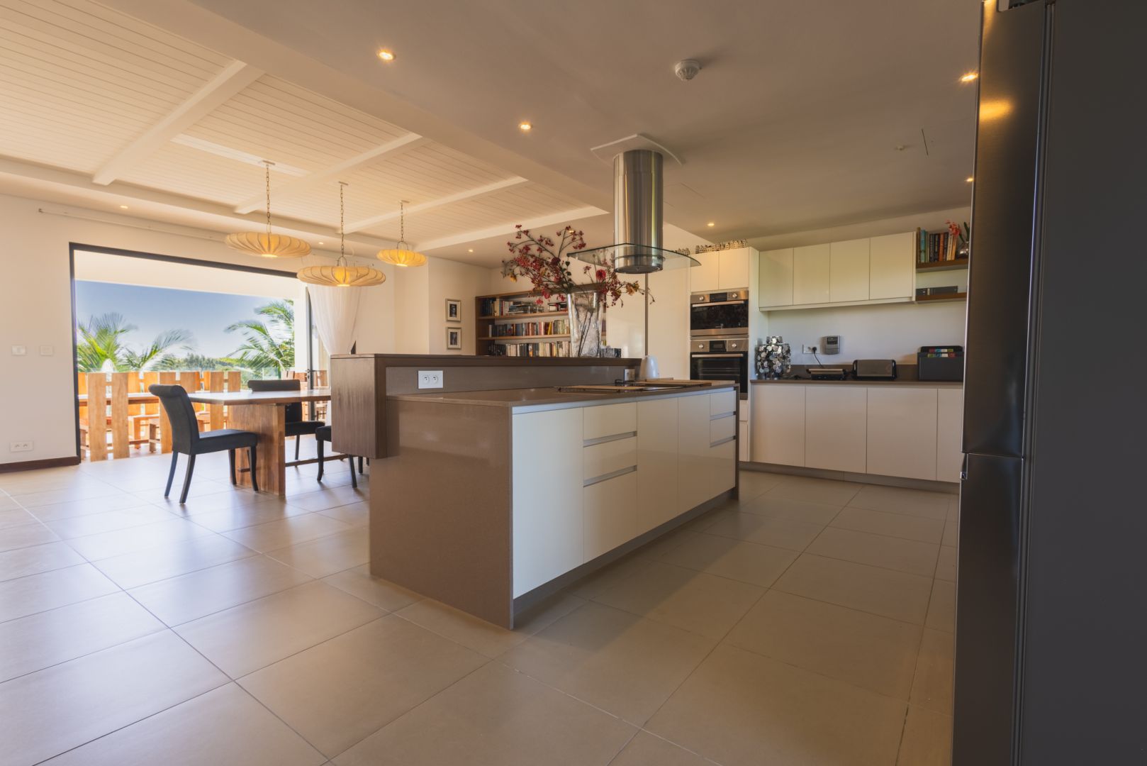 the large lounge and dining space, opening onto an expansive terrace where sea