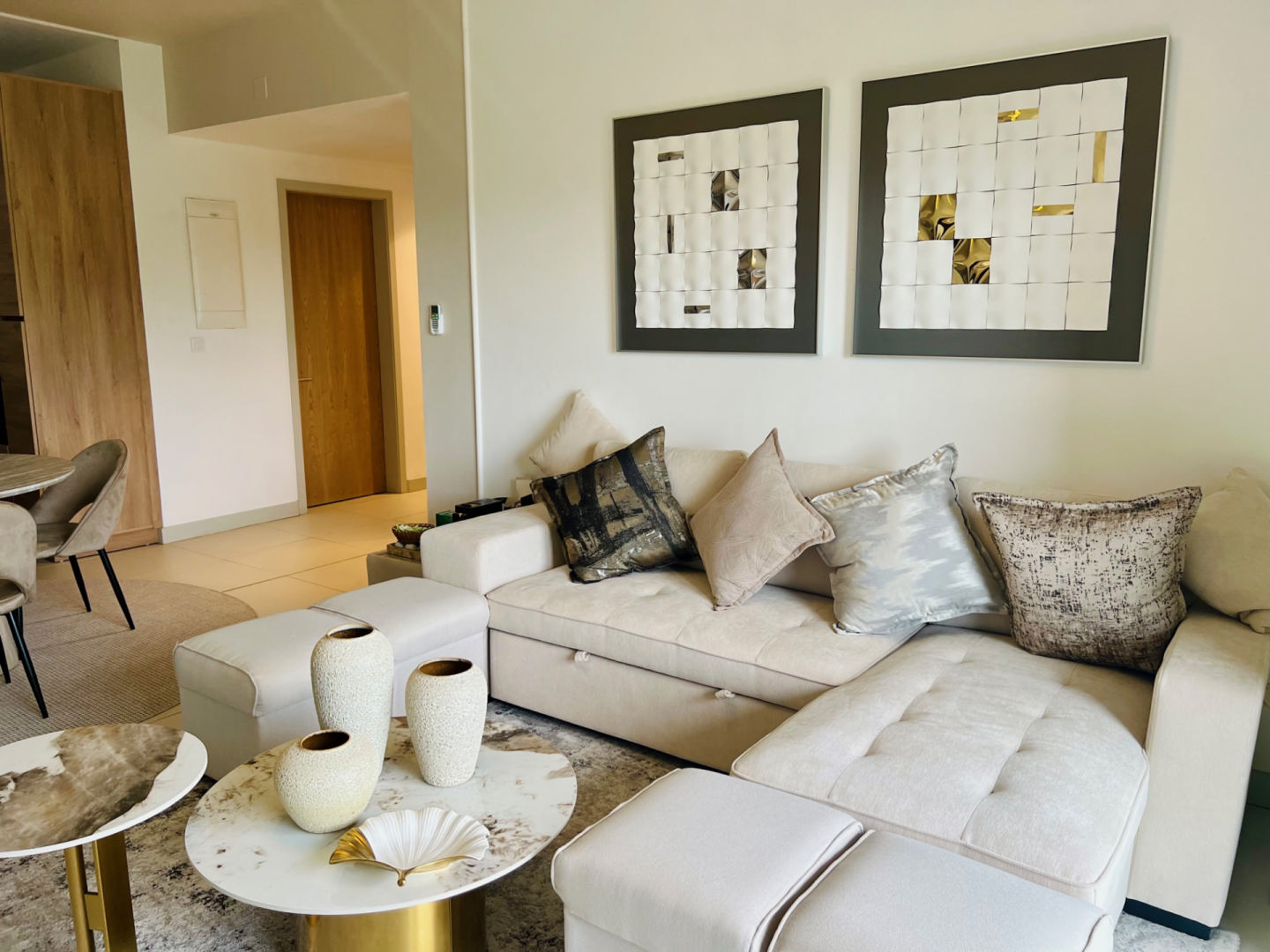Tastefully furnished throughout, the apartment features a bright and inviting living space that opens onto a serene environment. The well-designed layout includes three spacious bedrooms and two modern bathrooms, ensuring comfort for families or those seeking a refined lifestyle.
