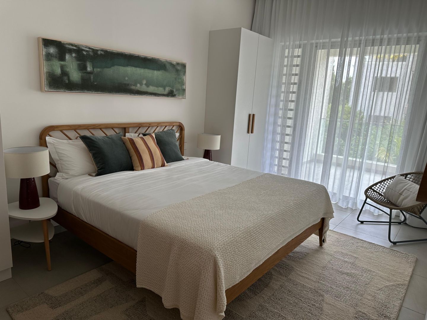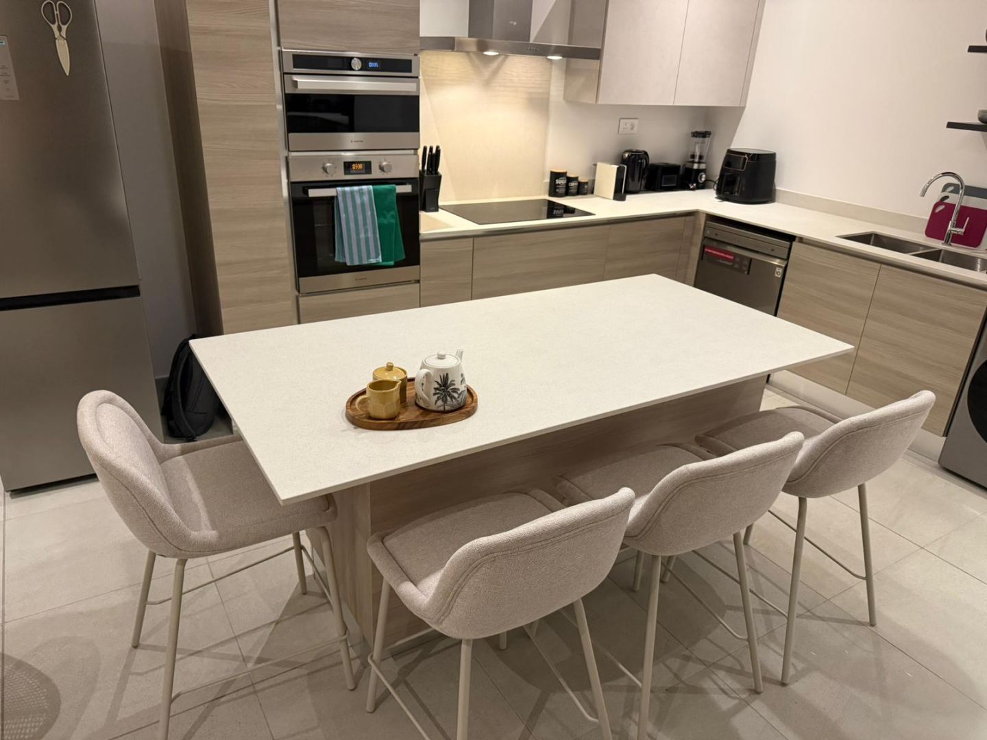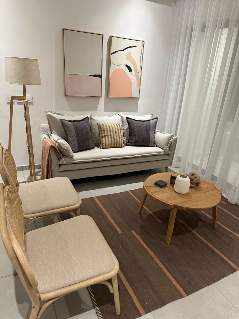 The apartment is fully and tastefully furnished, and completely equipped for immediate occupation. Clean lines, quality finishes and a calm, neutral palette create a space that feels both welcoming and practical. The generous living and dining area opens onto an east-facing balcony, where cooling breezes and shade make it a natural spot for warm afternoons.