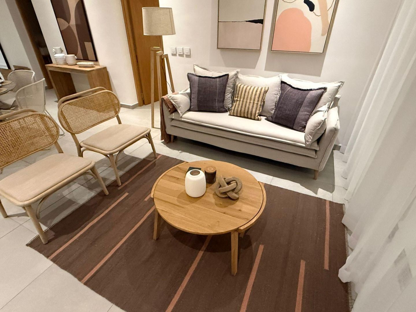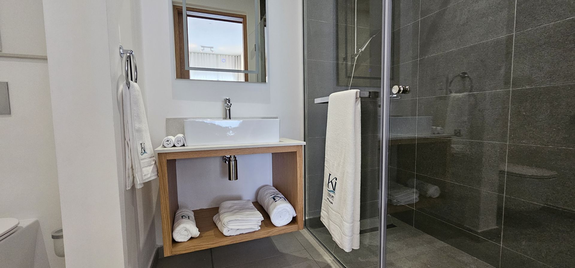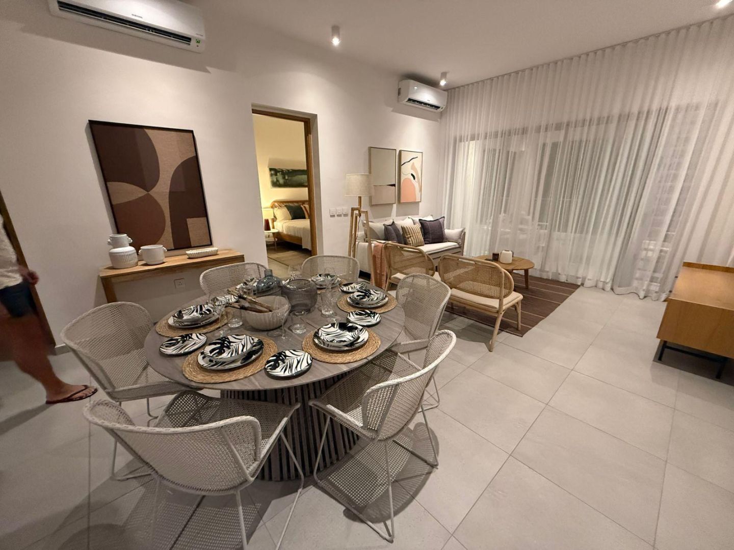The apartment is fully and tastefully furnished, and completely equipped for immediate occupation. Clean lines, quality finishes and a calm, neutral palette create a space that feels both welcoming and practical. The generous living and dining area opens onto an east-facing balcony, where cooling breezes and shade make it a natural spot for warm afternoons.