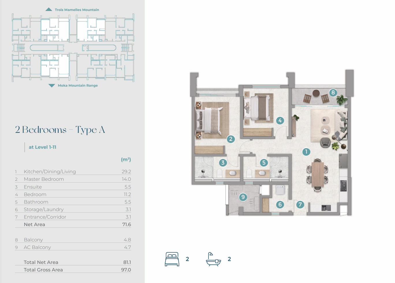2 Bedrooms ( 1 En-suite), 2 bathrooms Apartment - 97 m2 ranging from Rs 10,750,000 to Rs 11,550,000.