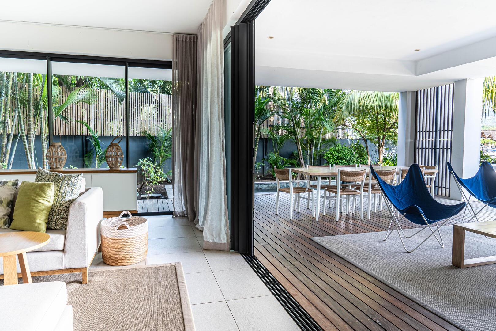 The expansive terrace seamlessly flows into a lush garden, providing a serene
