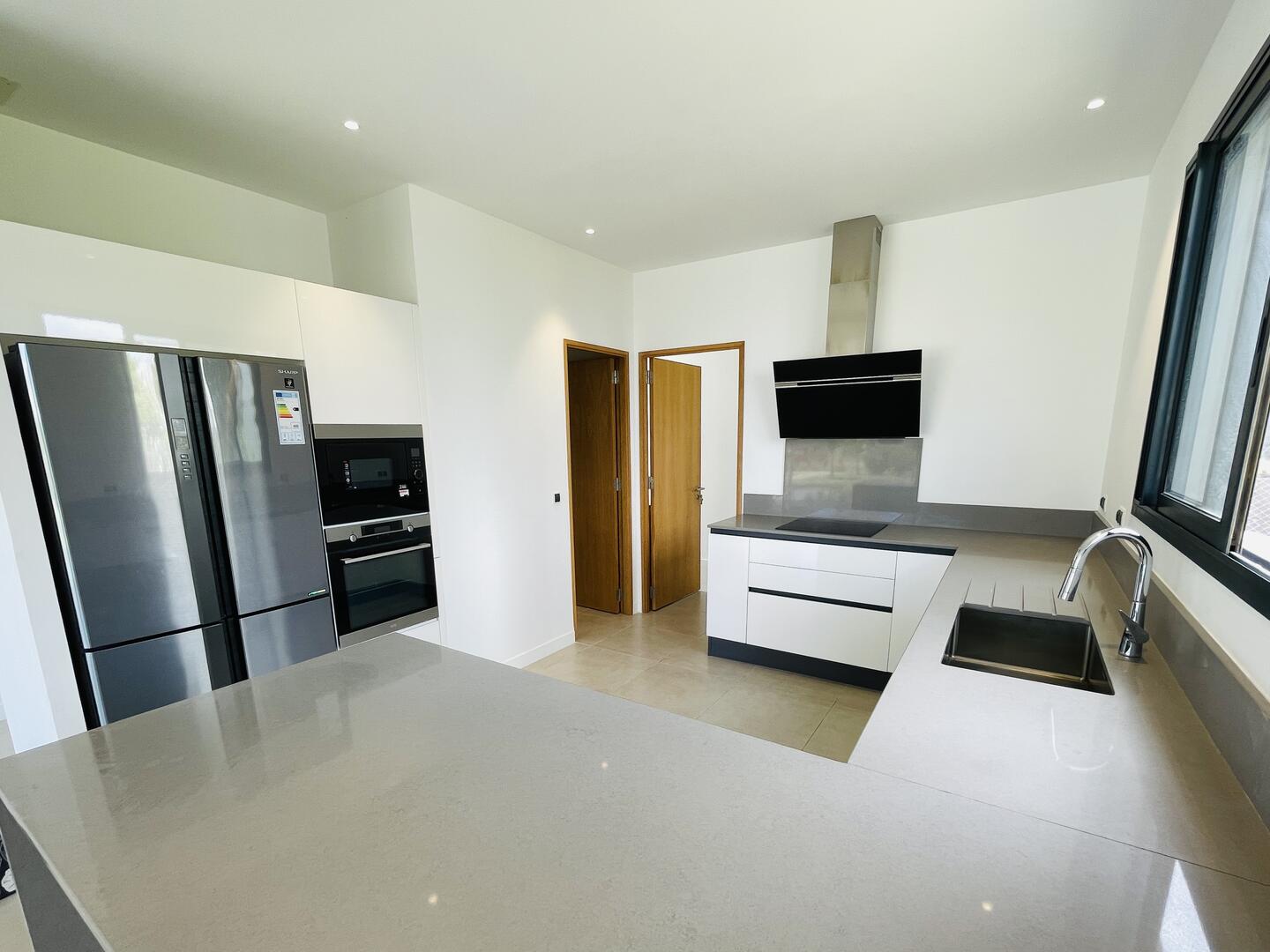 The villa’s layout is both practical and inviting. At its centre, an expansive open-plan living and dining area connects seamlessly to the outdoors through wide openings that lead onto a deep terrace. The space is filled with natural light, offering a daily reminder of the surrounding garden and private swimming pool. The landscaped grounds provide both beauty and privacy, creating a tranquil setting for family life or quiet retreat.