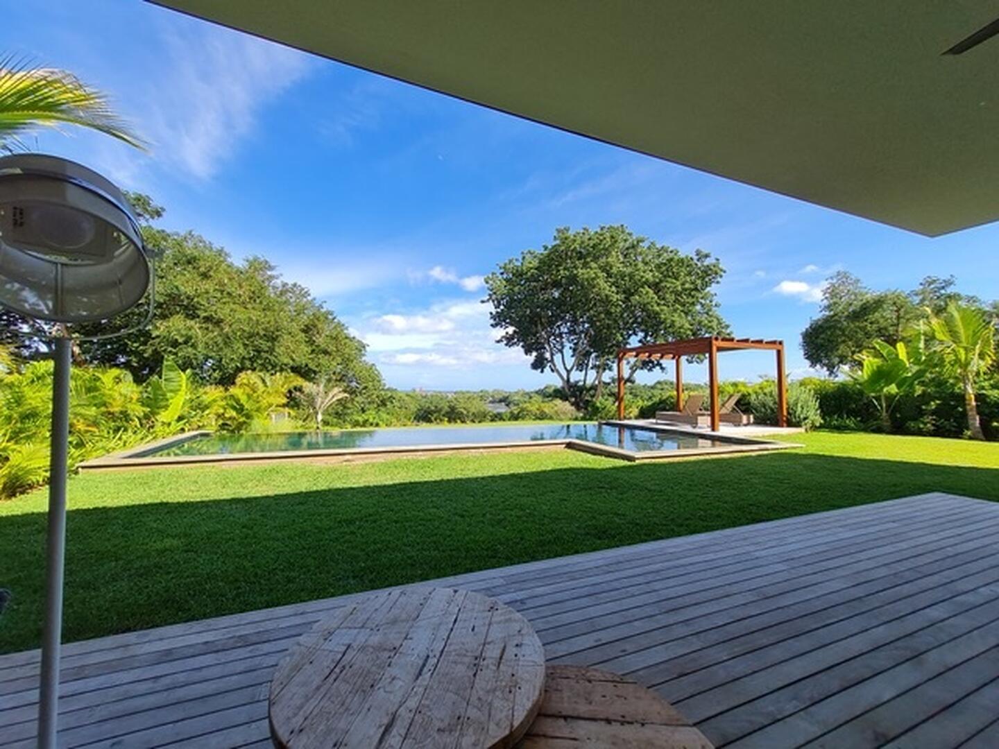 overflow rim pool stretches out towards the landscaped garden, framing the