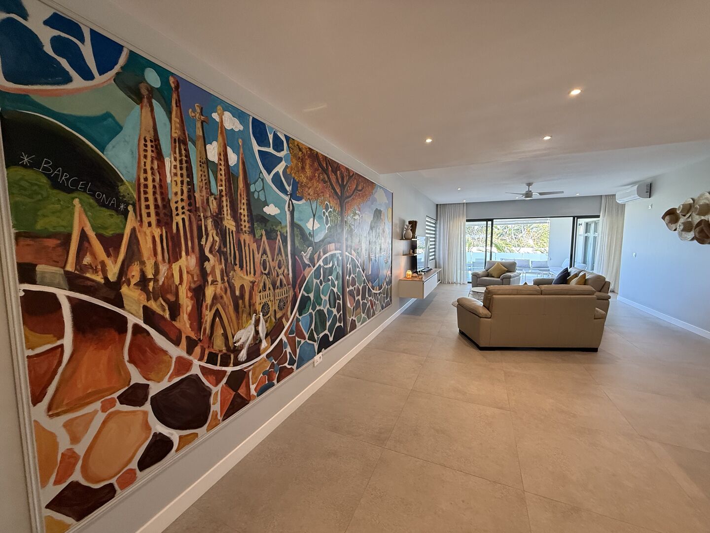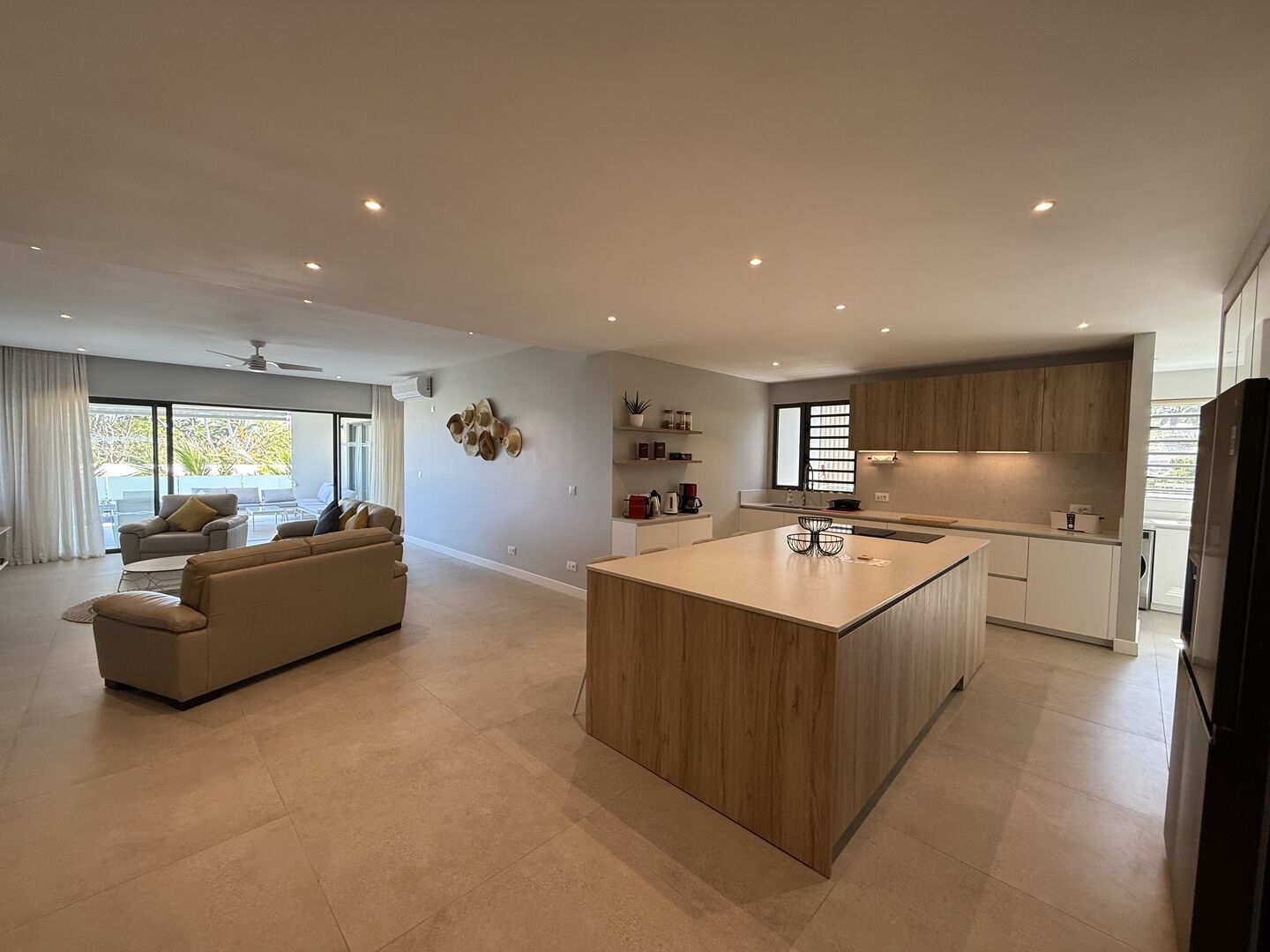 The apartment extends across approximately 205 m², with a layout that is both generous and easy to navigate. The open-plan living space forms the centre of the home, connecting a fully furnished lounge and dining area to a large covered patio. This transition is natural and functional, allowing the outdoor space to be used as an extension of the interior—equally suited to quiet mornings or informal gatherings.