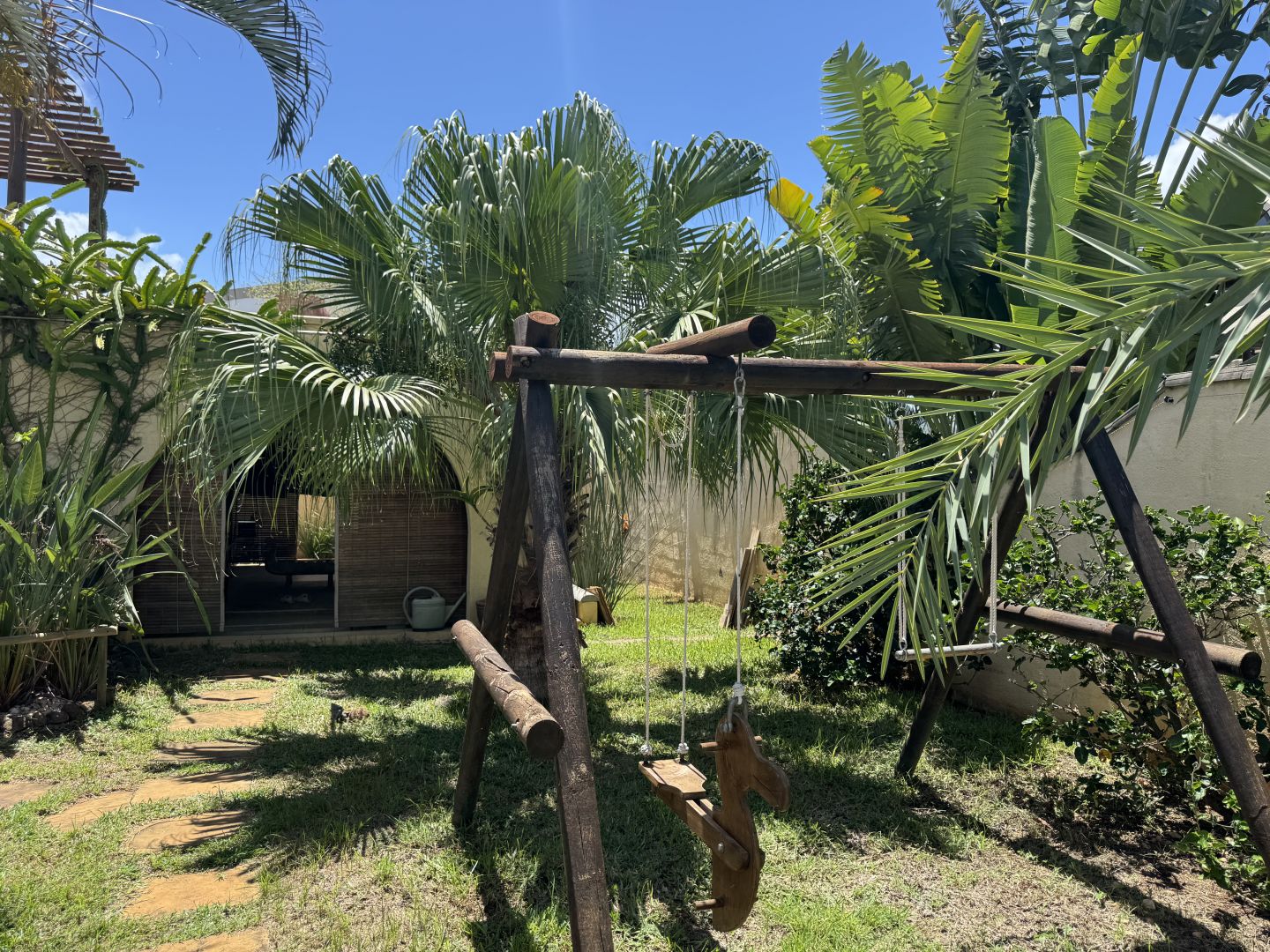 Le jardin, mature et soigneusement paysagé, accueille des arbres fruitiers tropicaux tels que le bananier, le fruit du dragon et le fruit de la passion. Les aspects pratiques ont été intégrés avec discrétion : un système d’irrigation alimenté par une citerne d’eau douce dédiée de 2 000 litres, un abri de jardin et de rangement pour l’équipement, ainsi qu’un espace barbecue en briques. Parmi les prestations complémentaires figurent un système de chauffe-eau solaire pour la maison, un garage indépendant avec espace de stationnement, une cave de stockage enterrée, une connexion internet fibre haut débit, ainsi qu’un dispositif de sécurité complet comprenant alarme et caméras de surveillance.