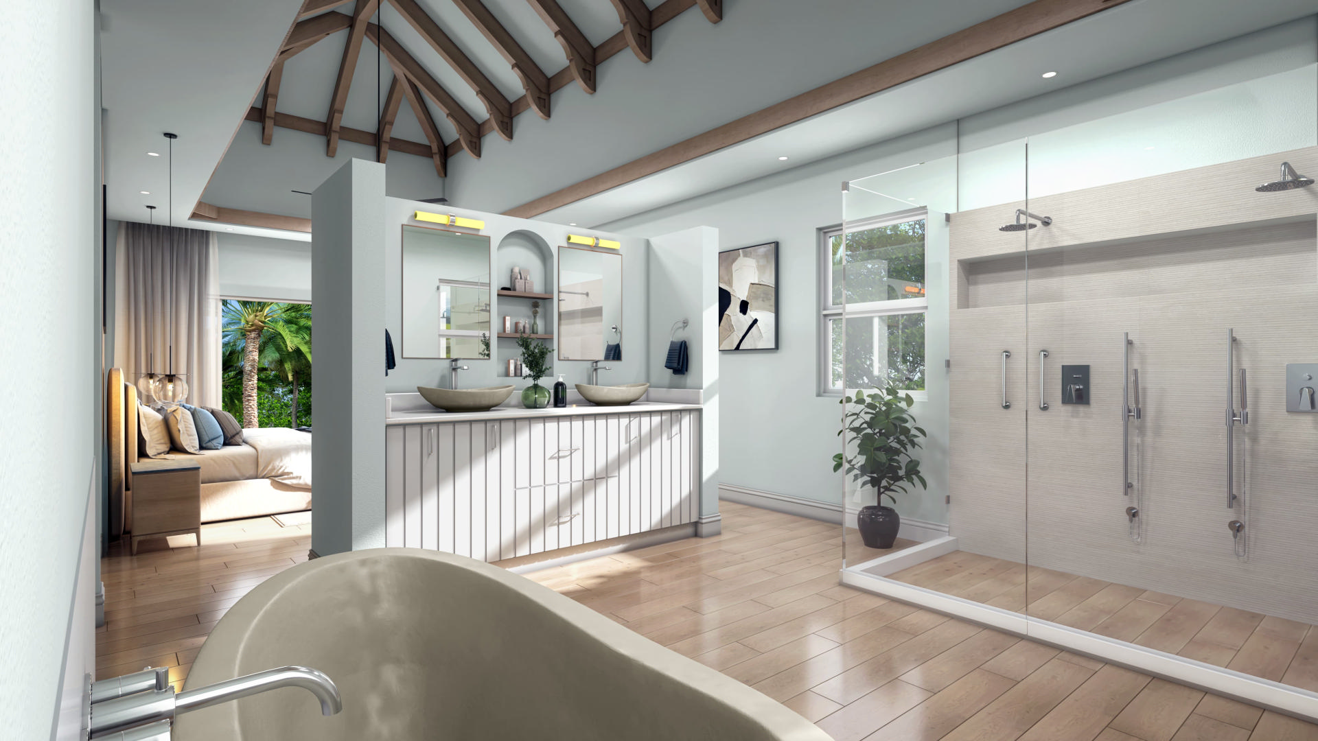 La chambre principale est un havre de paix personnel avec un plafond voûté offrant du volume, inondé de lumière depuis le patio, une salle de bain somptueuse avec double douche, baignoire séparée et douche extérieure, puis le fabuleux dressing.