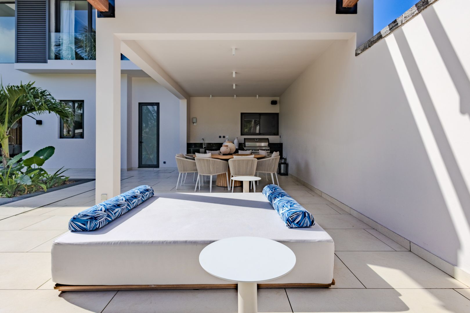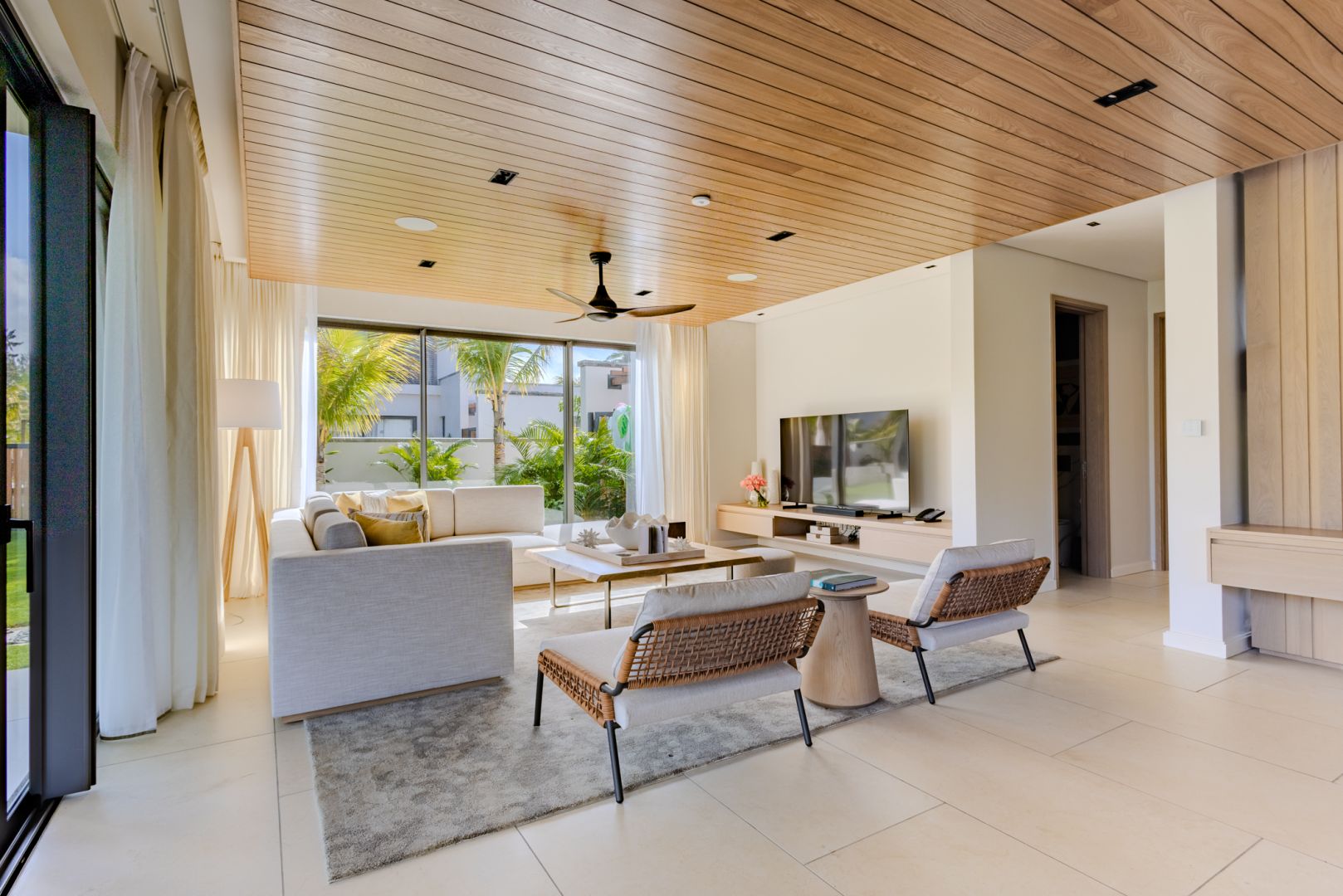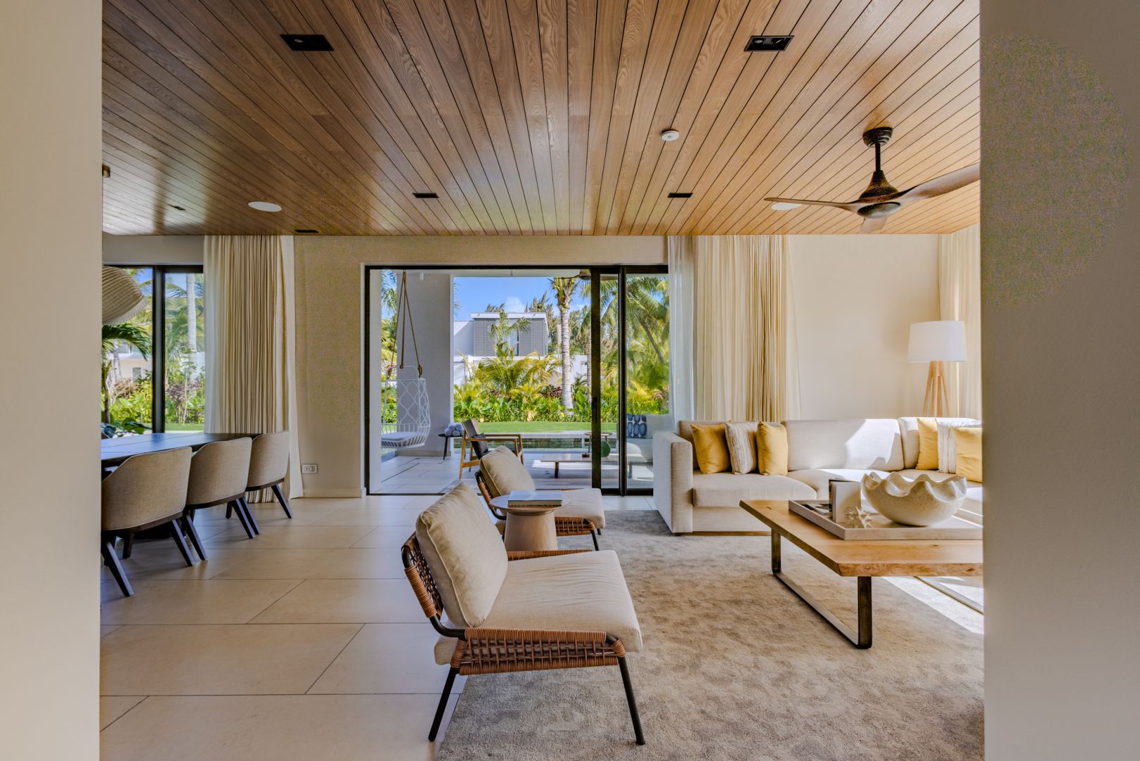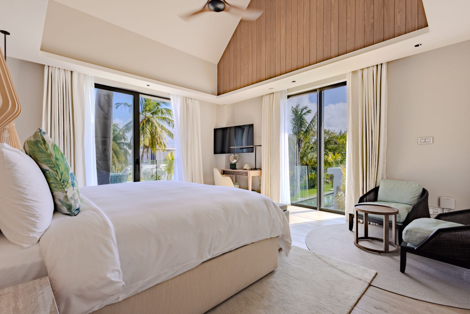 À l’intérieur, les volumes révèlent un style chaleureux et raffiné, textures naturelles, bois organiques et détails tissés s’unissent dans une harmonie apaisante. Chaque meuble, soigneusement sélectionné, sublime le design contemporain mauricien, pour un luxe pieds nus qui marie élégance et confort intemporel.
