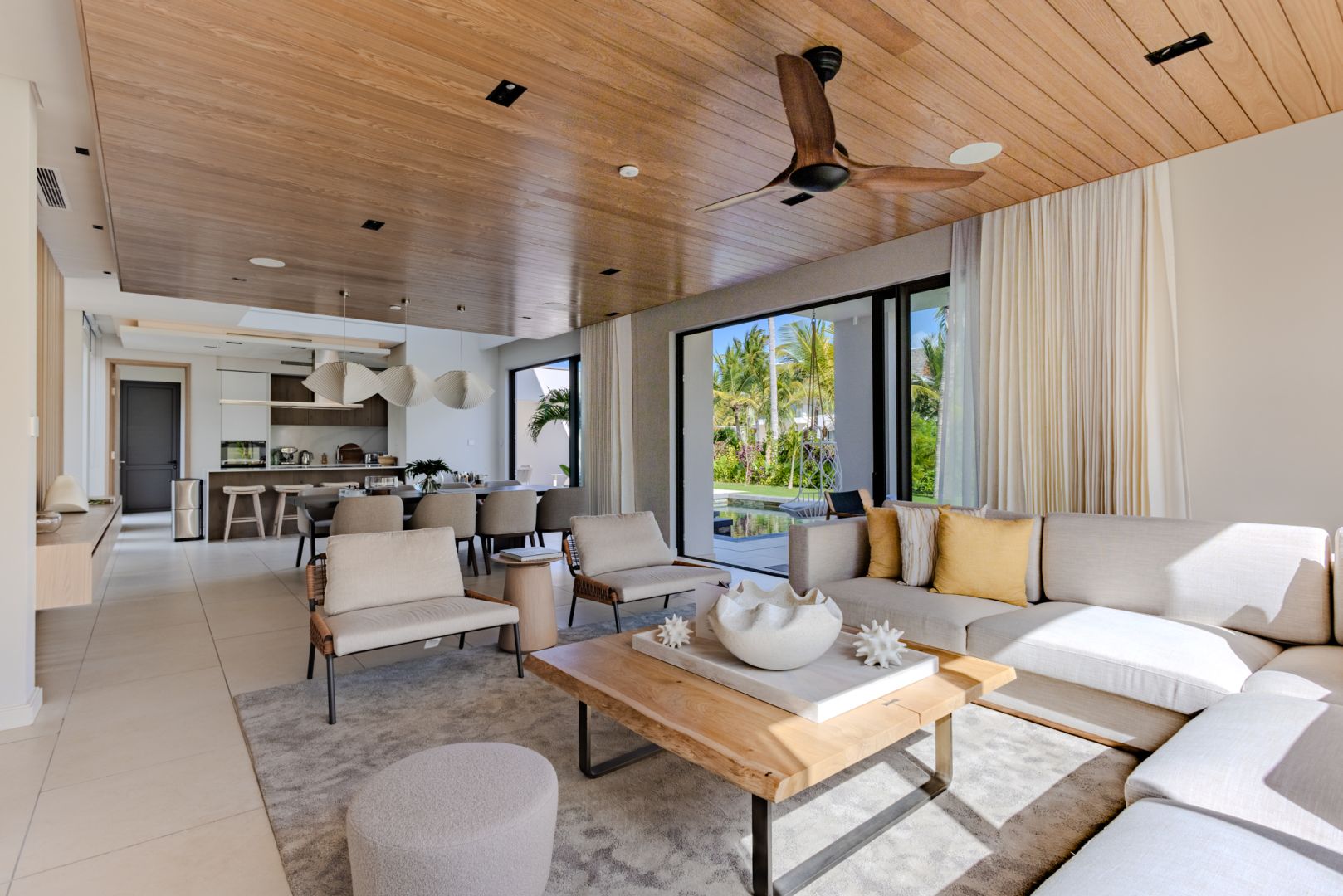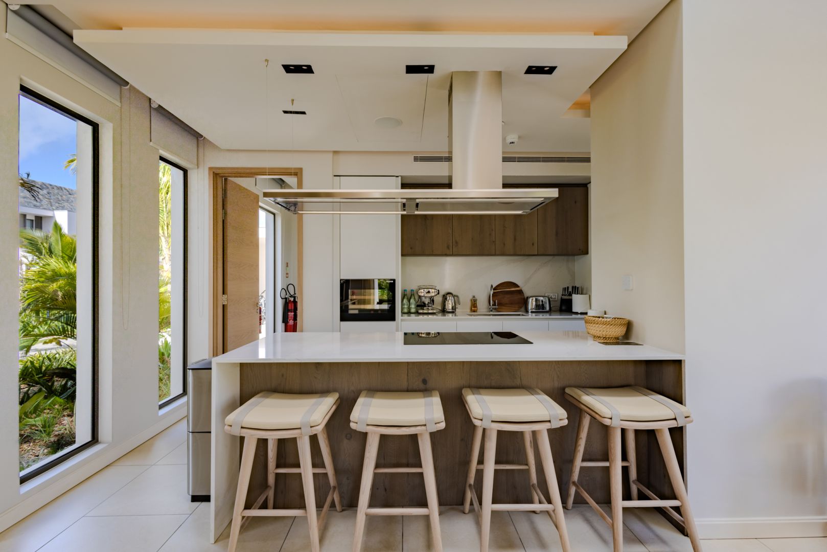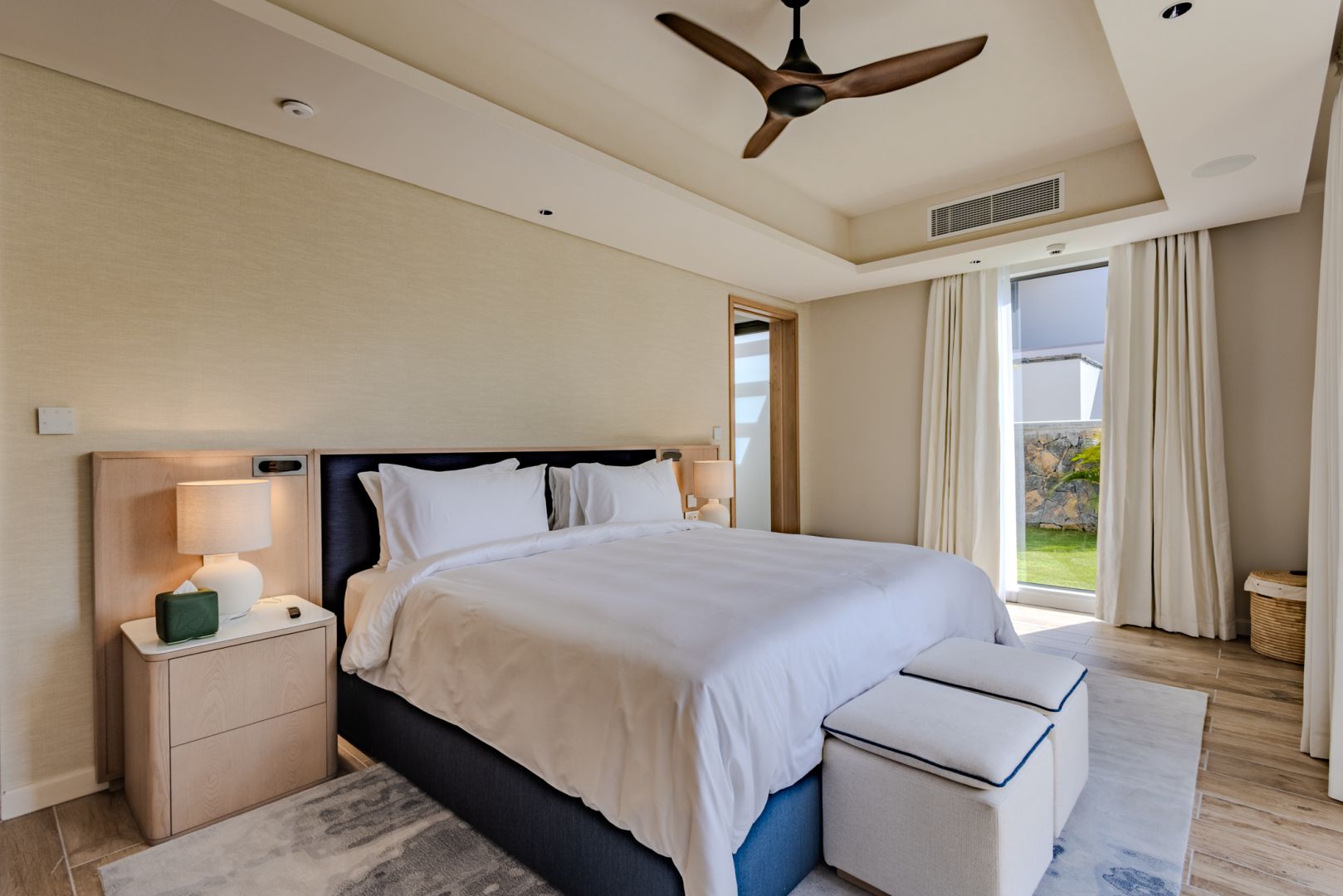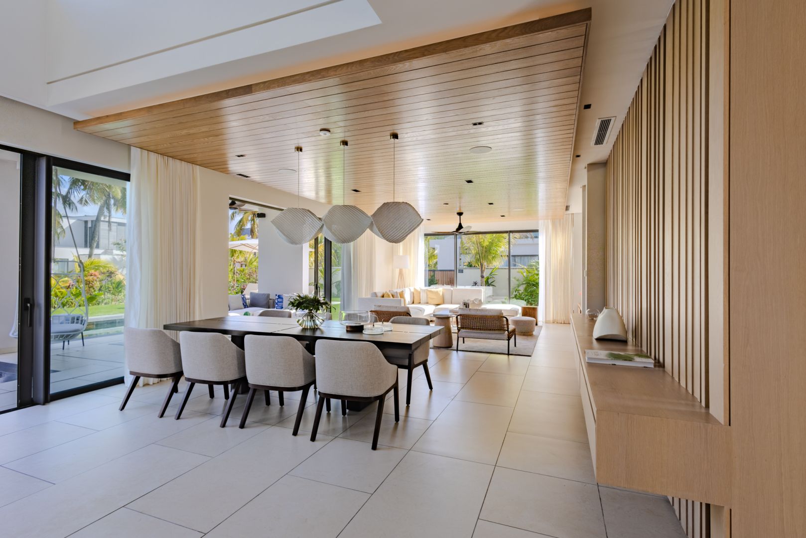 À l’intérieur, les volumes révèlent un style chaleureux et raffiné, textures naturelles, bois organiques et détails tissés s’unissent dans une harmonie apaisante. Chaque meuble, soigneusement sélectionné, sublime le design contemporain mauricien, pour un luxe pieds nus qui marie élégance et confort intemporel.