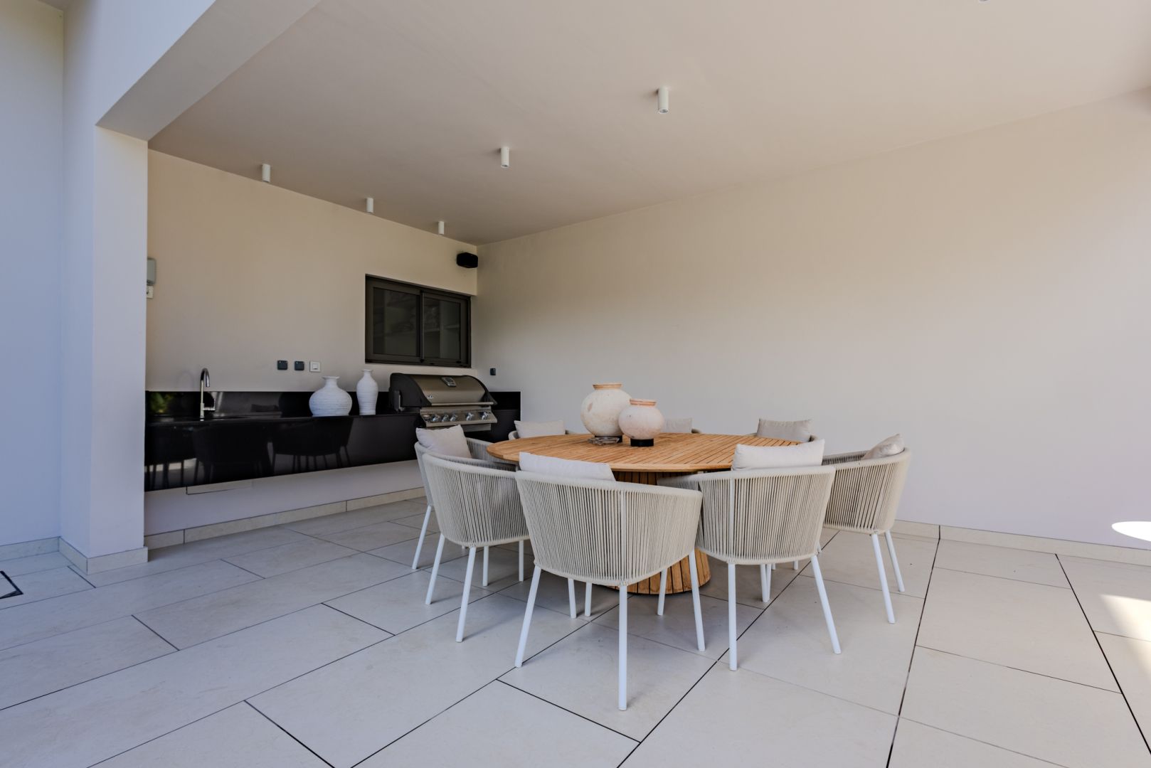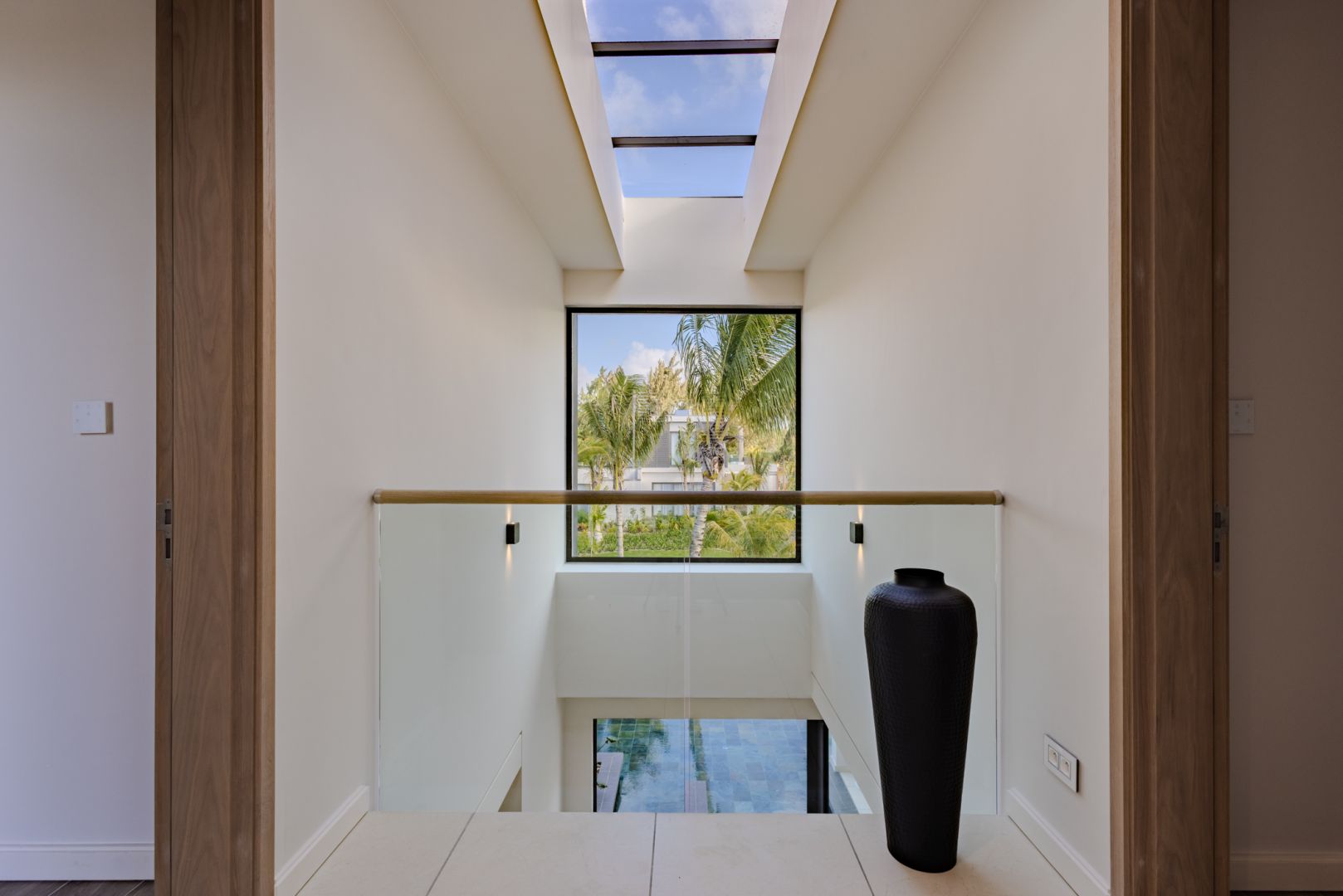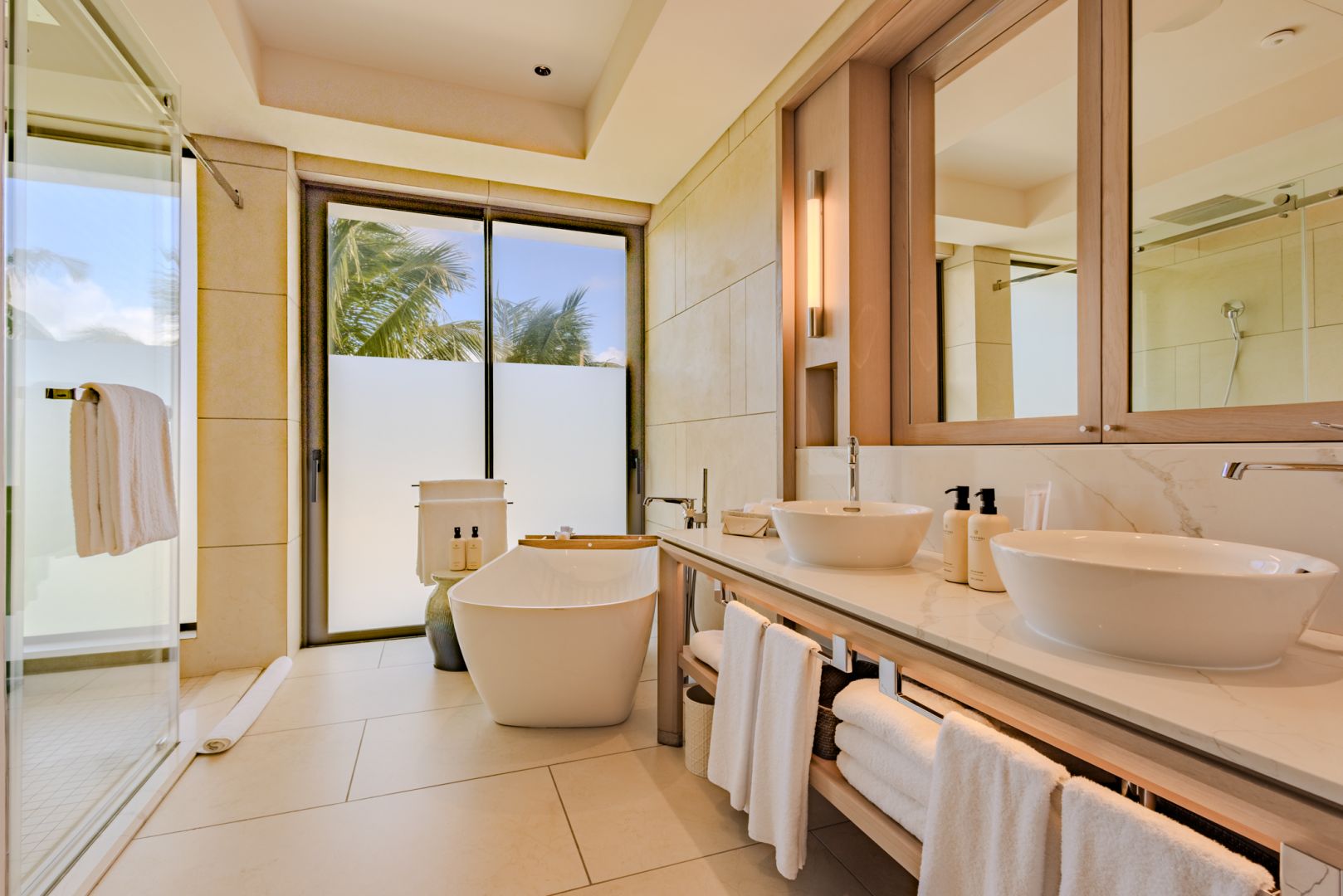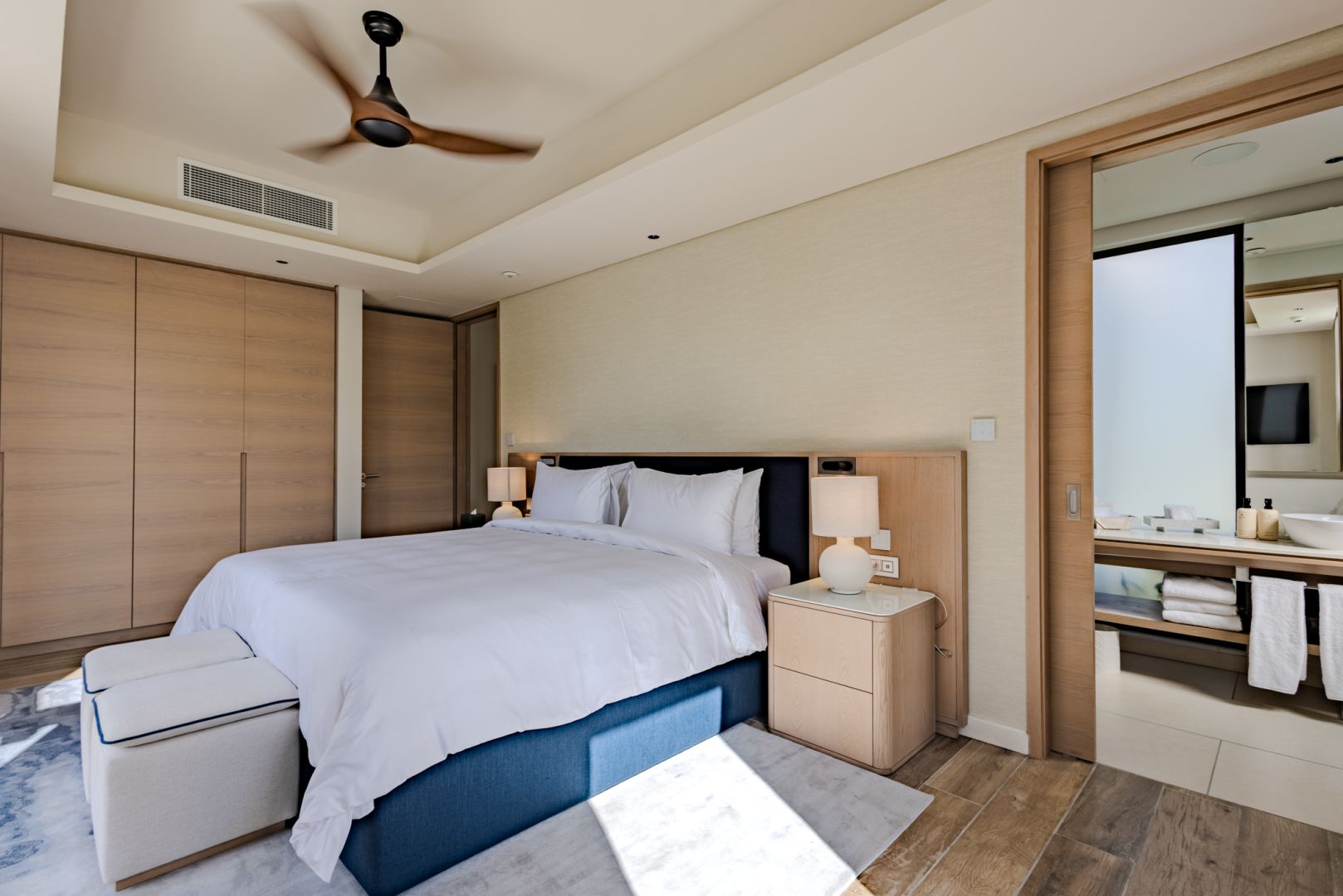À l’intérieur, les volumes révèlent un style chaleureux et raffiné, textures naturelles, bois organiques et détails tissés s’unissent dans une harmonie apaisante. Chaque meuble, soigneusement sélectionné, sublime le design contemporain mauricien, pour un luxe pieds nus qui marie élégance et confort intemporel.