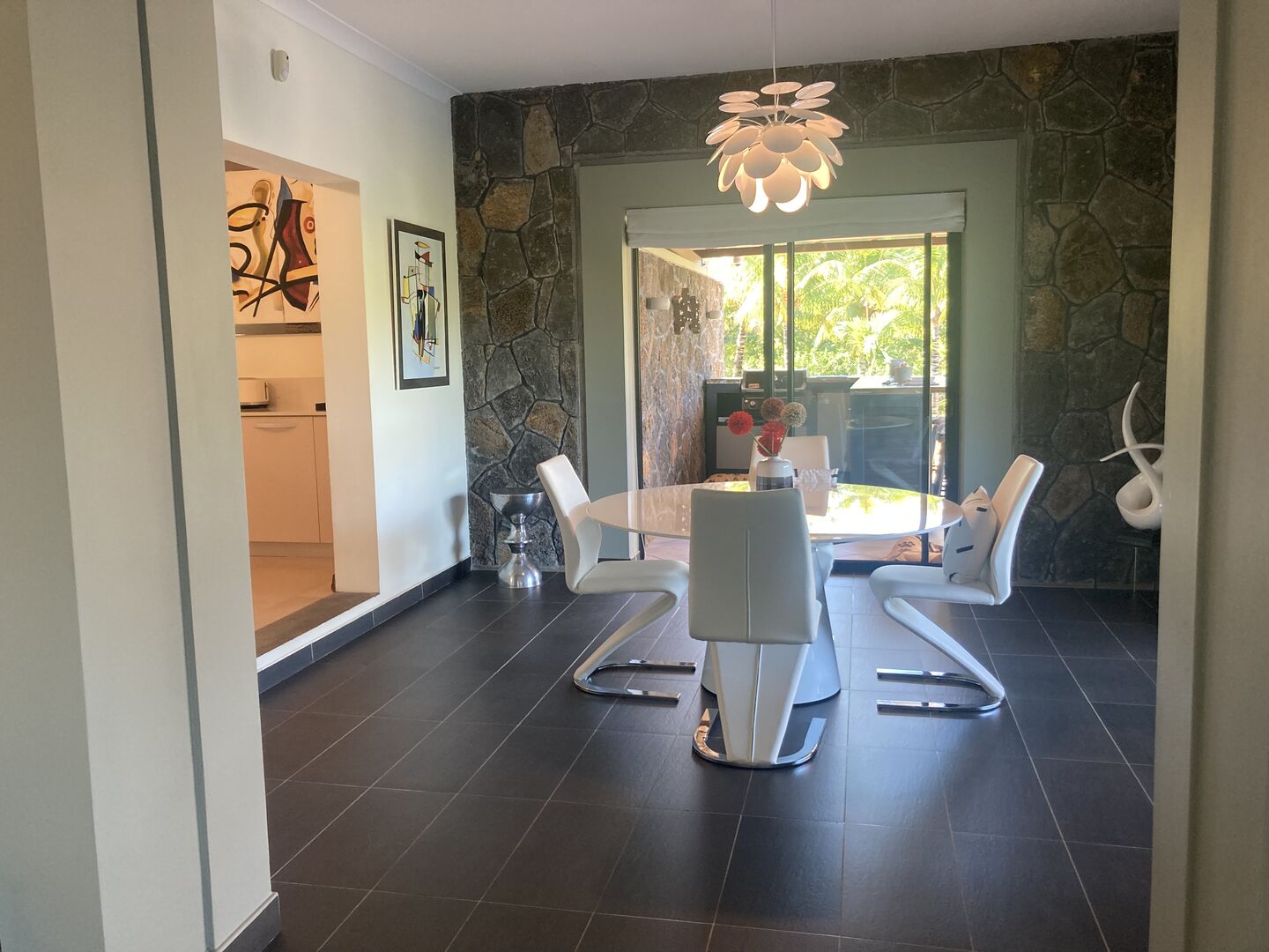 L’espace de vie principal s’étend sur environ 100 m², réunissant le hall d’entrée, le salon et la salle à manger dans une configuration ouverte, fluide sans être excessive. À proximité, la cuisine et les espaces de service sont pratiques et bien intégrés, complétés par un garage et de nombreux espaces de rangement dans toute la maison. Les intérieurs sont entretenus avec soin, avec des finitions contemporaines à la fois sobres et fonctionnelles.