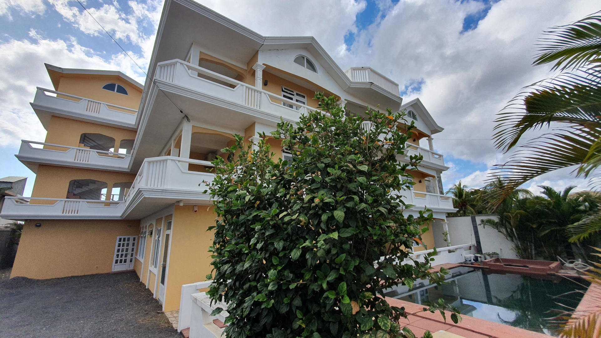 La propriété présente de nombreuses caractéristiques, y compris une façade élégante avec une piscine commune. Elle présente également de hauts plafonds, des balcons enveloppants à chaque étage, de grandes fenêtres et des colonnes d'époque. Un parking est disponible pour six voitures ou plus.