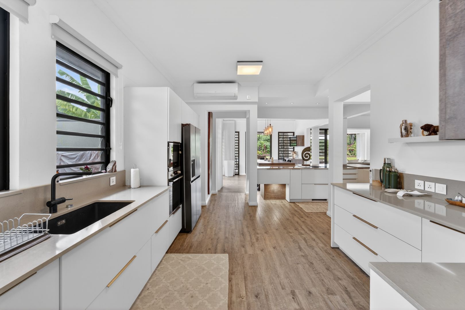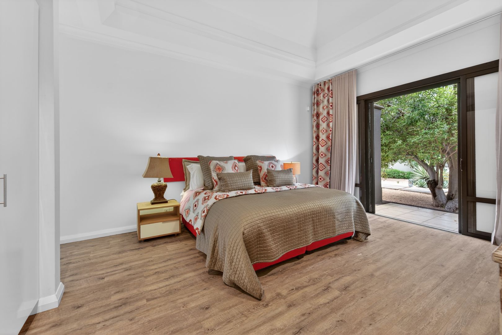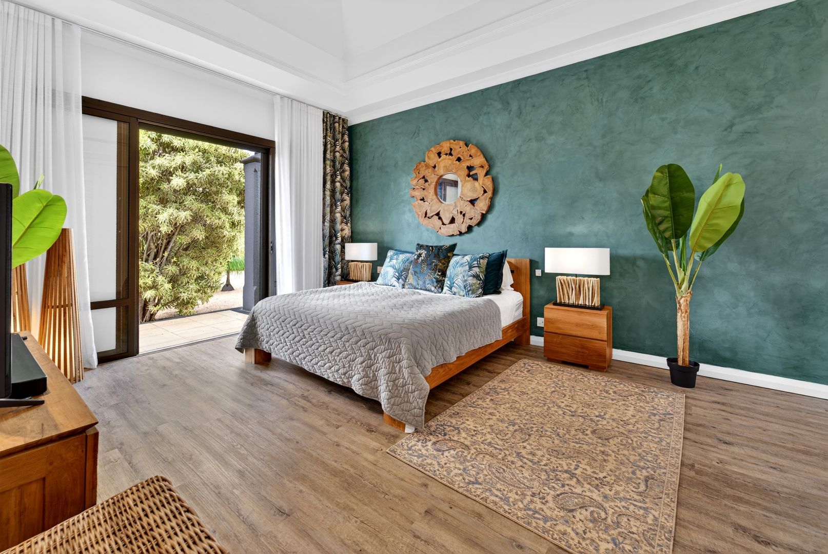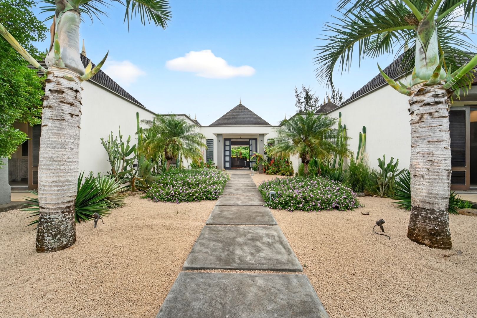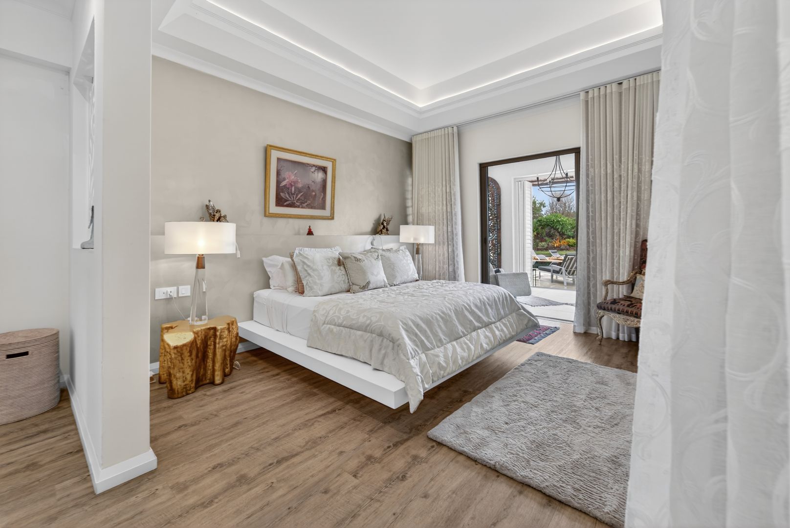 La suite parentale s’ouvre directement sur la terrasse et le jardin, et dispose d’une salle de bains spacieuse ainsi que d’une douche extérieure privée, apportant une touche tropicale subtile. Les autres chambres, tout aussi généreuses, sont disposées avec soin, dont deux bénéficiant d’un accès direct au jardin arrière par de larges baies vitrées. Des éléments pratiques tels qu’un garage, de nombreuses places de stationnement — y compris pour les voiturettes de golf — ainsi qu’une buanderie et un espace de rangement, permettent à la villa de fonctionner confortablement comme résidence principale.