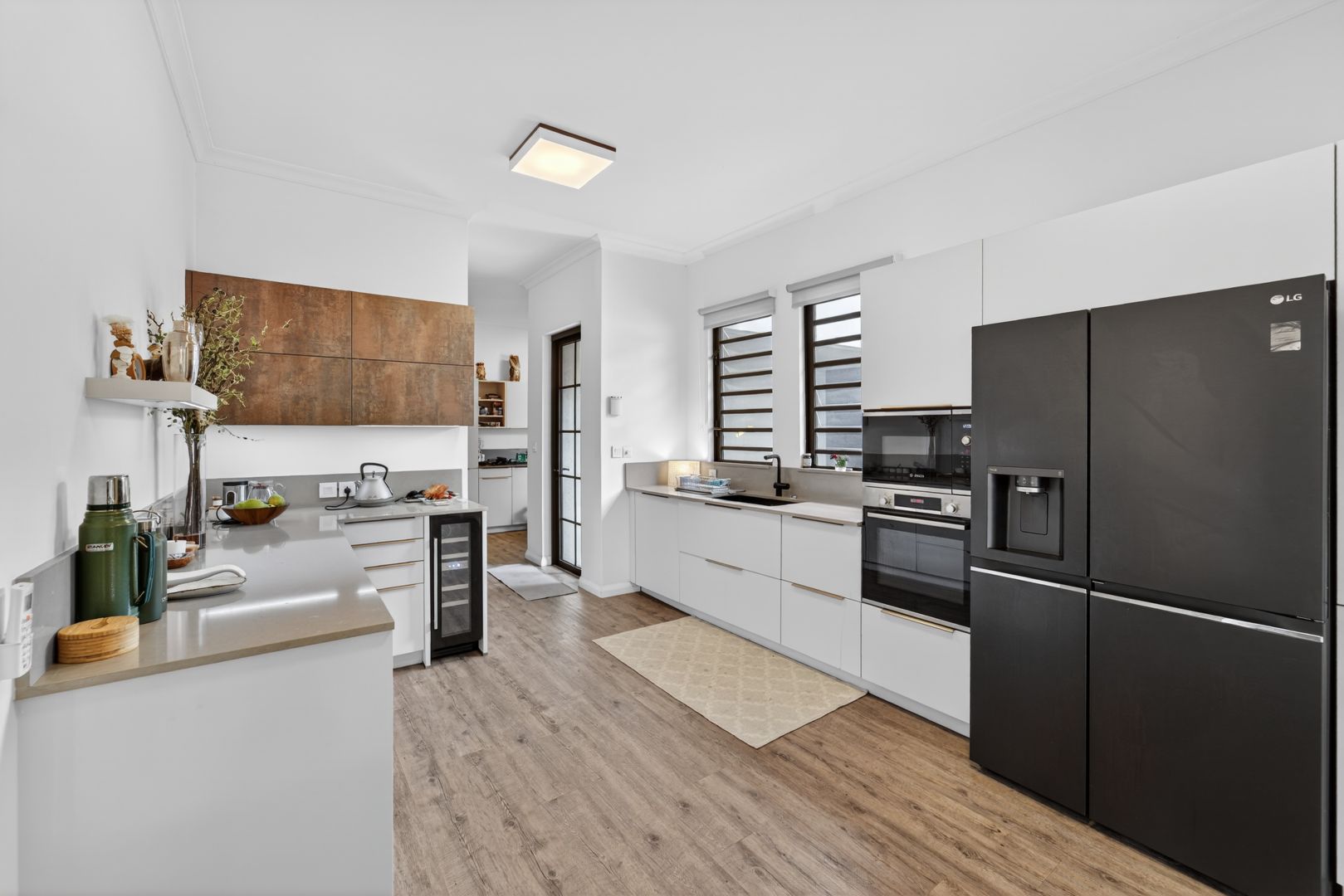 La villa se distingue par ses volumes généreux, ses hauts plafonds et ses larges ouvertures qui favorisent une circulation naturelle de la lumière et de l’air. Les espaces de vie sont organisés en plan ouvert, structurés autour d’une cuisine bien proportionnée qui surplombe le salon principal et se prolonge par un cellier indépendant. L’agencement privilégie la fonctionnalité et le confort, pensé pour une vie quotidienne fluide plutôt que pour l’apparat.