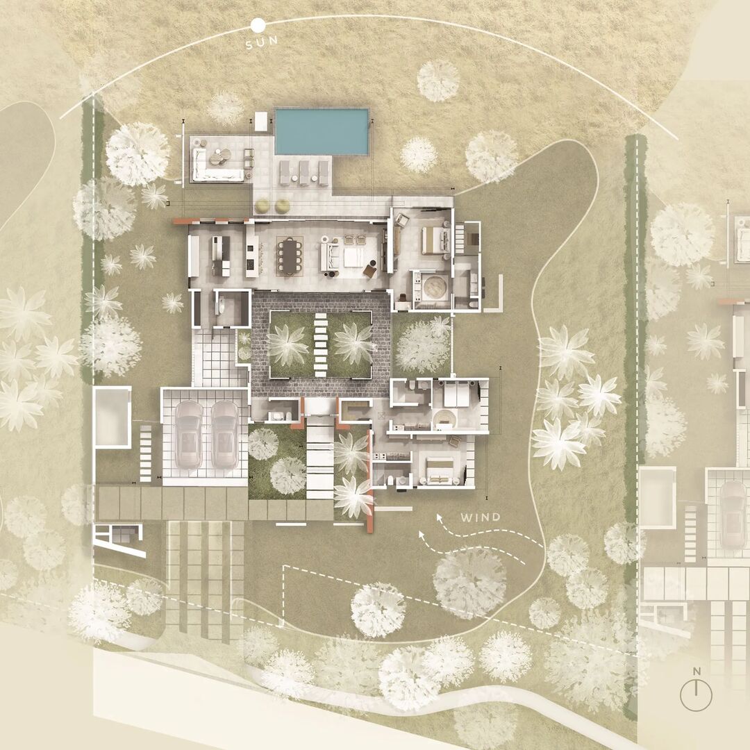 Située au sein du domaine établi de Harmonie Golf & Beach Estate, la Villa N propose une approche maîtrisée de la vie de plain-pied, où l’espace, la lumière et l’agencement s’équilibrent avec précision sur un terrain généreux de 1 660 m². La résidence s’étend sur 469 m² et s’organise autour d’un patio intérieur discret, qui structure subtilement la circulation et l’atmosphère de l’ensemble.