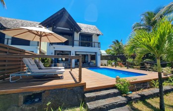 Discover a magnificent modern villa set directly on the beach in the prime residential area of Pointe aux Canonniers, offering an exceptional, unobstructed view on the Northern Island and the sparkling lagoon stretching out before it. This luxurious 4-bedroom, 4-bathroom villa forms part of an exclusive, secure residence, providing both prestige and peace of mind in one of the most sought-after coastal neighborhoods.Designed with contemporary elegance, the villa features sleek architectural lines and expansive glass openings that flood each room with natural light while framing the breathtaking island panorama. Every bedroom includes its own beautifully finished en-suite bathroom, blending comfort and sophistication.Outdoors, a private pool overlooks the beach and the Northern Island beyond, creating an idyllic setting for serene mornings, sunset cocktails, or effortless entertaining. The villa is surrounded by a lush private garden, with full landscaping and general maintenance included, ensuring a seamless and carefree lifestyle.This property represents the finest in beachfront living—combining modern luxury, unparalleled views, and a prestigious address.A rare opportunity to own a high-quality beachfront villa in Pointe aux Canonniers, with a captivating view on the Northern Island.