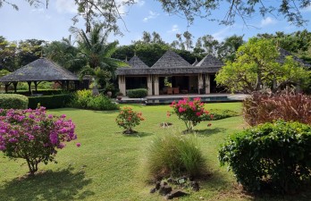 Located against the 15th fairway of the popular west coast residential golf estate of Tamarina you will find this charming and discreet villa in a Balinese influenced style. Set within a pleasantly landscaped and manicured garden with trees and bushes alike, the property offers a peace and tranquillity in its cosy setting. Facing a south easterly direction, this well maintained 4 bedroom villa comes with the typical large and spacious verandah with views across the inviting slate lined swimming pool and views of the lush vegetation beyond and the mountain range behind. An interesting focal point of this villa is the extra large kiosk constructed to allow for large group entertainment and which can accommodate perhaps a dinner for 20 persons or as a family area with children etc.
