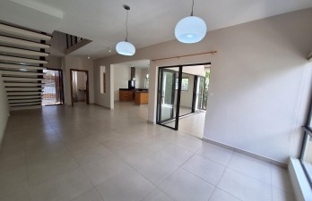 A sleek staircase leads to the three bedrooms upstairs, where natural light fills the spaces. The master ensuite has its own balcony, a private corner to take in the surroundings, while the other two bedrooms share a well-appointed bathroom. Each room is finished with attention to proportion, making the home feel generous yet easy to maintain.
