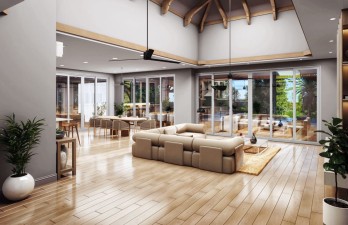 The villa has been designed with entertaining in mind, featuring a covered patio area suitable for a 10–12 seater dining table as well as a lounge set. Large stacking doors allow the living areas to open fully to the outdoors, complemented by wooden shutters that can completely enclose the glass openings when desired, ensuring both flexibility and privacy.